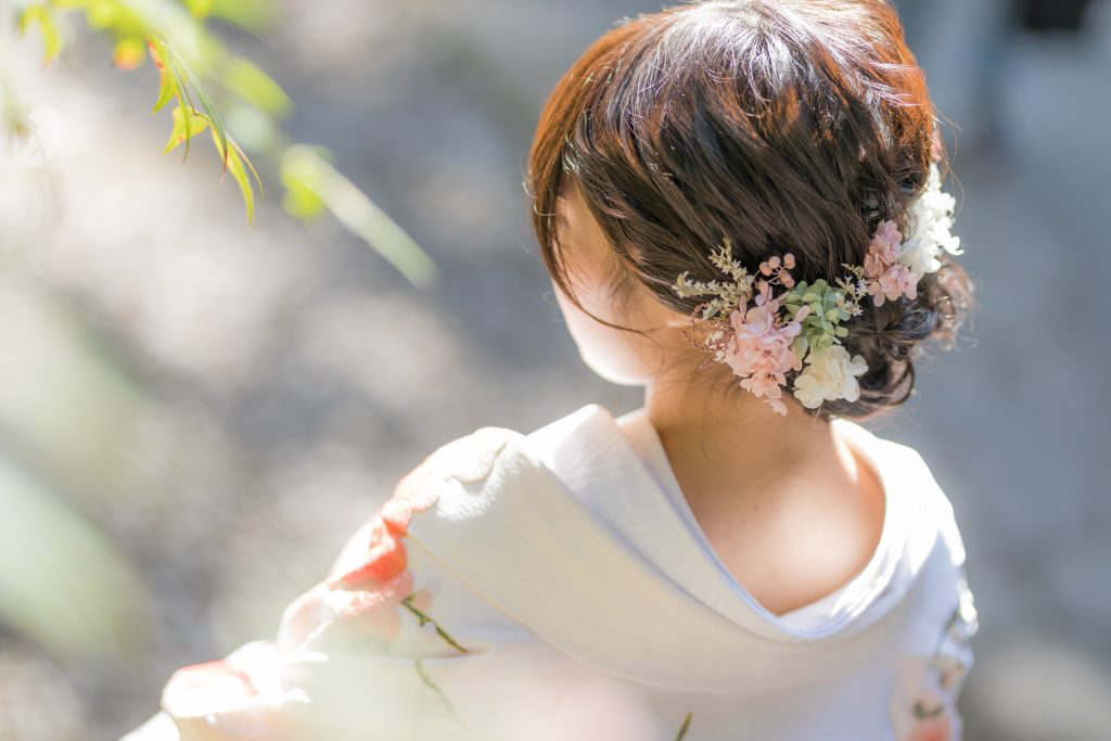 大きなお花のヘアードをつけたり、プリザーブドフラワーを飾ったり、和風のヘア、可愛らしいヘアとスタイルは花嫁さんの数だけあります!