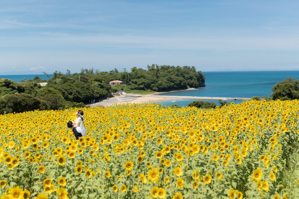 7月、8月にフォトウエディングや前撮りを検討中の方!ひまわりと青い海、青い空、全てが揃った絶景ロケーションへ撮影に出かけましょう!