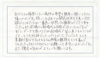 私たちは交際期間中に、お互いの身内と会う機会がほとんどなかった為、交流の場を設け、2人の思い出というより両家の共通の思い出にしたいと思ったので知人で出張サービスのあるPASSIONさんへお願いしました。