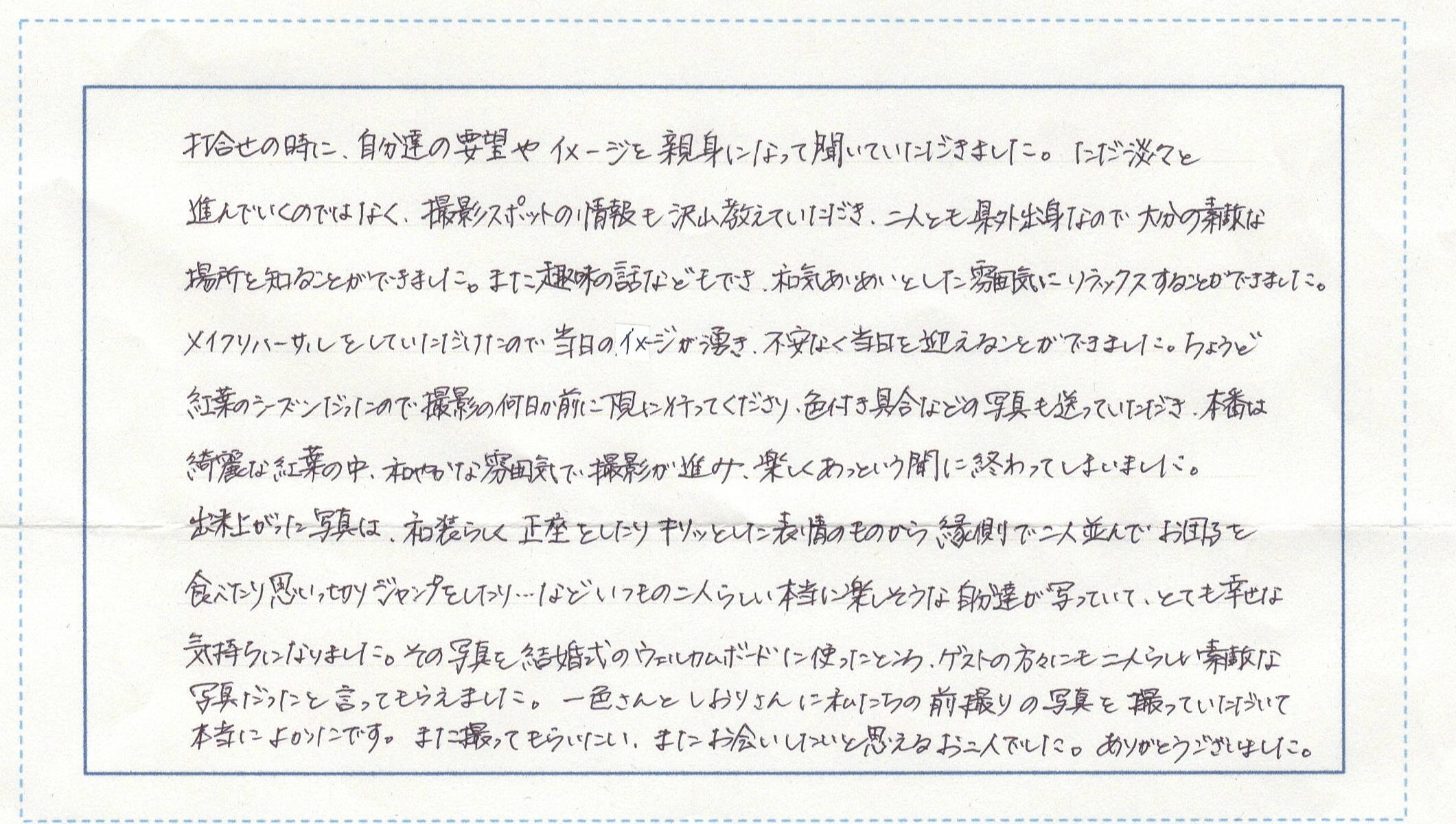 ちょうど紅葉のシーズンだったので撮影の何日か前に下見に行ってくださり、色付き具合などの写真も送っていただき、本番は綺麗な紅葉の中、和やかな雰囲気で撮影が進み、楽しくあっという間に終わってしまいました。
