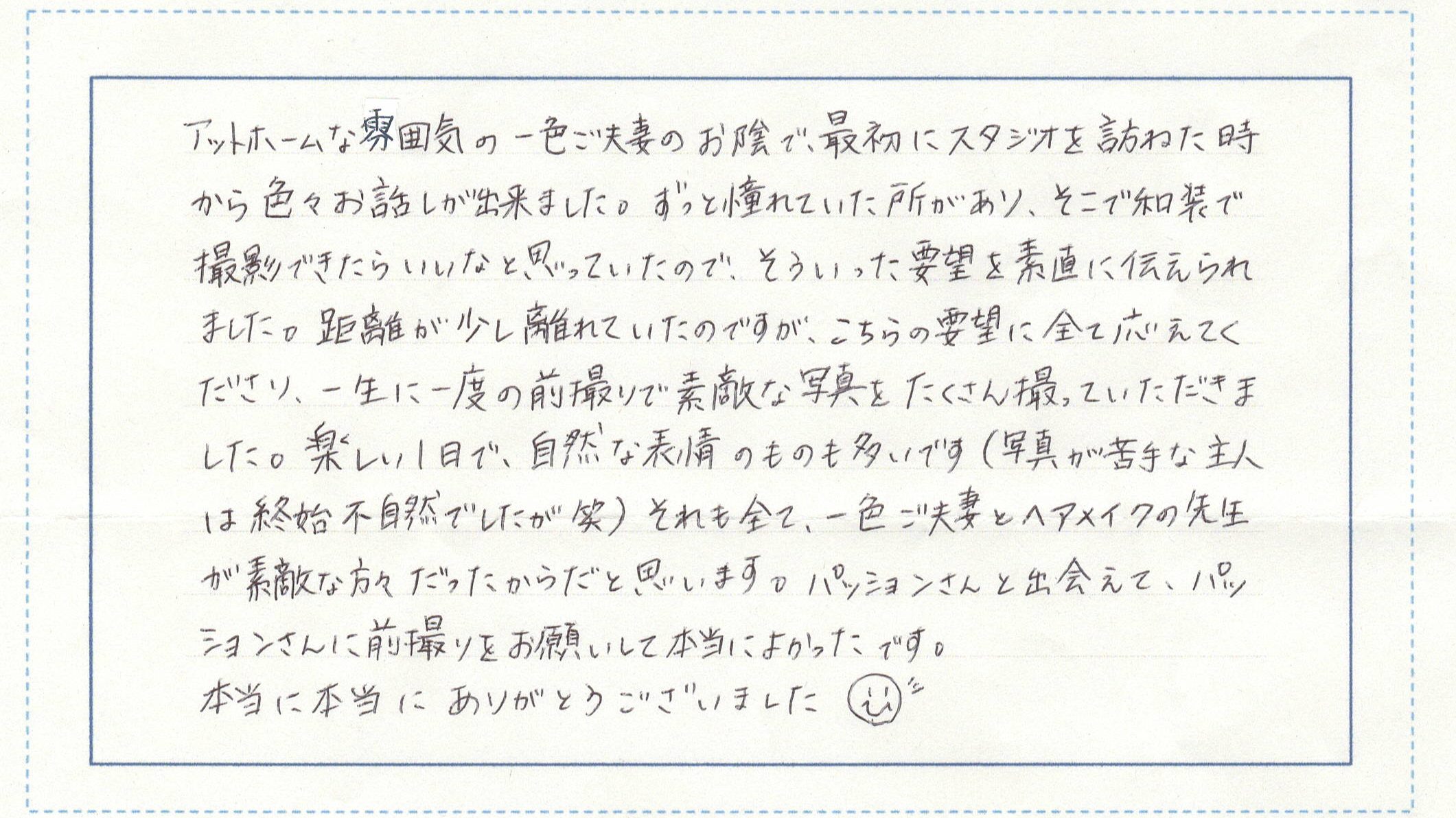 私たちと一緒の気持になってその時間を大切にしてくれた、気さくで話しやすくて美男美女な一色さんご夫婦。