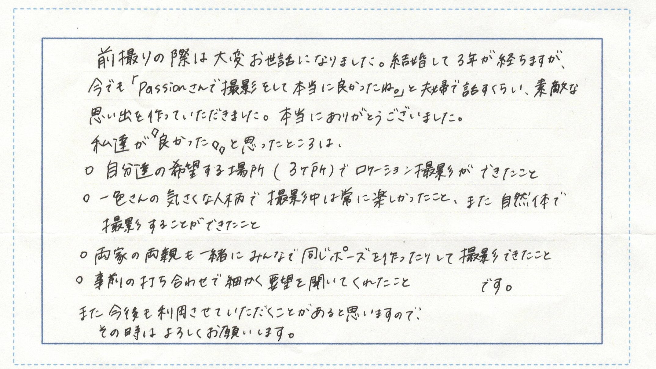 結婚して3年が経ちますが、今でも「PASSONさんで撮影をして本当に良かったね。」と夫婦で話すくらい、素敵な思い出を作っていただきました。