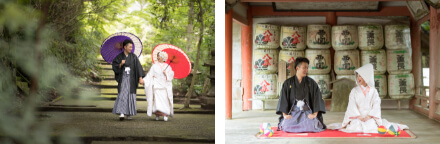 一生に一度の大事なウエディングフォトだからこそ、タキシードとウエディングドレス、紋付袴と白無垢や色打掛と、ご満足いただける衣装で、おふたりの理想のウエディングフォトを叶えます。
